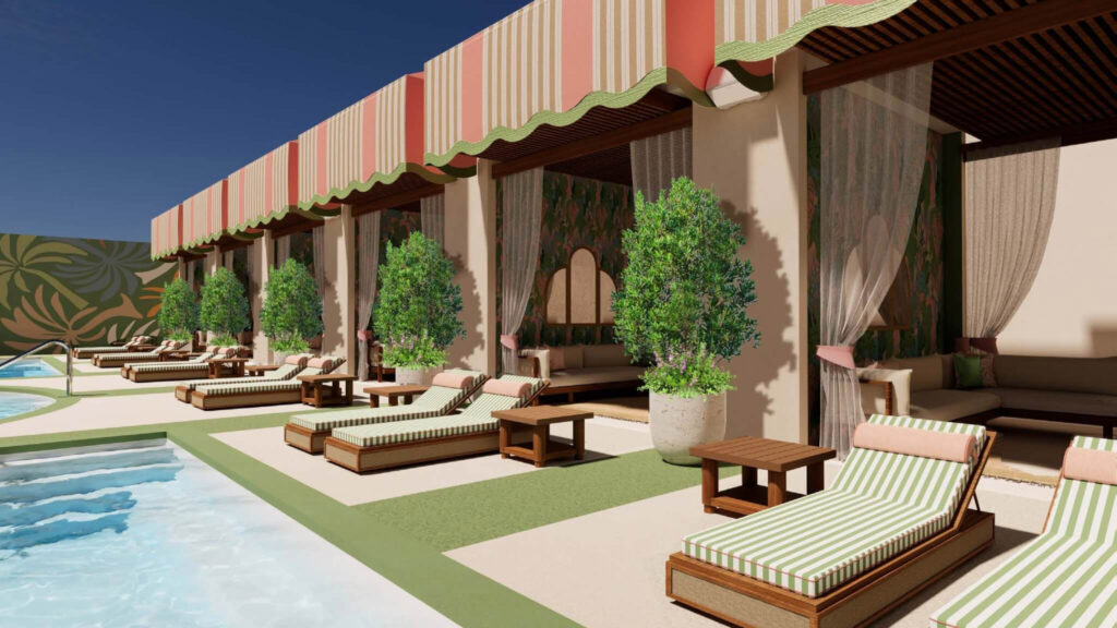 Setting eases into verdant calm. The pool basin gleams with turquoise tiles and vine-draped rails, sunlight filtering through fronds to speckle surfaces as arrays warm from pale yellows in openers to saturated corals on swells. Cabanas frame pockets of shade with canvas roofs and low partitions for contained talks, while open decks invite broader drifts with mist poles and edge barriers. This arrangement tracks tempo drifts: melodic builds over the main basin yield to lighter charts in wings, where reverb softens for easy exchanges. Projections map frond shadows or ripple effects across the water, tying the tableau with restraint short of saturation.