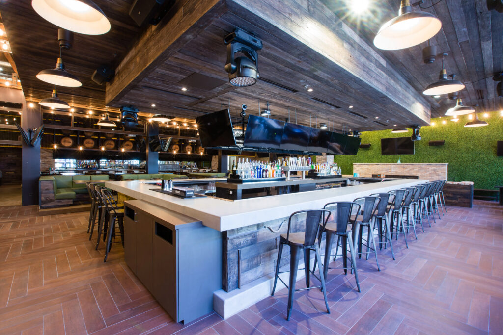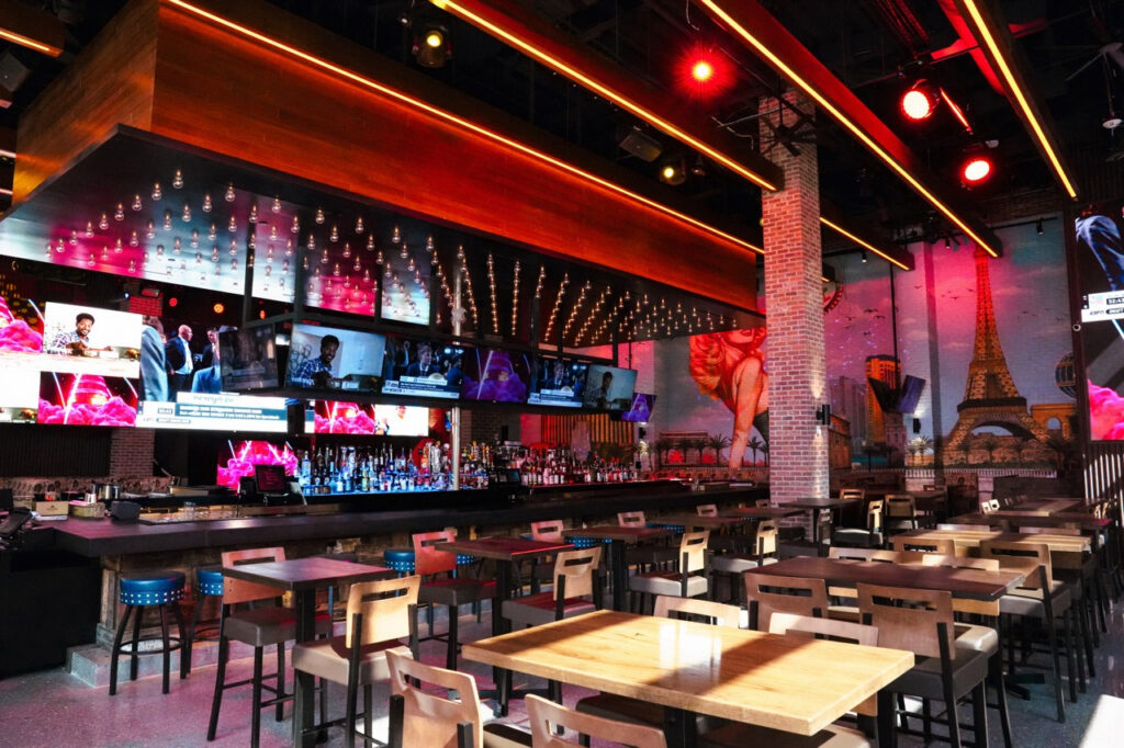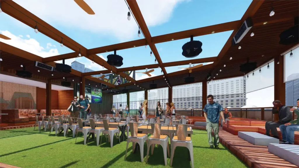 The venue’s rhythm builds progressively, with stairs and elevators facilitating easy hops between floors, from the steady hum of game-day cheers below to the rooftop’s escalating thrum under starlit skies. Door staff apply a casual vetting, drawing a cross-section of sports fans, after-work locals, and inbound tourists. Daytime draws measured flows around screens, ramping to evening peaks where subwoofers test the structure—projections flicker across the LED facade, and foam sprays cut through the heat during set climaxes. Bachelor parties leverage the vertical spread, claiming rooftop pods for 10 or bar-leaning stools on the middle level, supporting fluid group shifts and skyline selfies from the terrace rail. Crews in fitted polos handle the pace, restocking pitchers and adjusting barriers to preserve momentum amid the soundtrack and chatter.