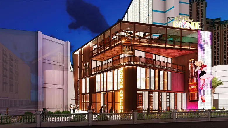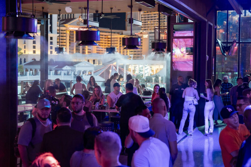 Anchored at the Horseshoe Las Vegas on the bustling Strip corner of Flamingo and Las Vegas Boulevard, Bottled Blonde emerges as a $50 million, three-story powerhouse blending daytime sports haven with nighttime party surge across 20,000 square feet. Visitors approach from the Grand Bazaar Shops, stepping into the ground-floor restaurant where communal tables line up under warm pendants, then ascending to the second-floor sports bar with its 38-foot LED wall and over 40 HD screens encircling circular bars. The crown jewel unfolds on the third-floor rooftop terrace, an open-air expanse with cabanas hugging the edge for direct sightlines to the Bellagio fountains and city sprawl. Running daily from 11 a.m. for lunch into the early morning—extending to 4 a.m. on weekends—Bottled Blonde pulls in groups for bottle service and table reservations, morphing casual hangs into charged escapades suited for bachelor parties and crew takeovers.
