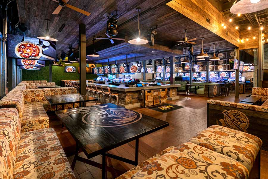 Setting adjusts layer by layer. The ground floor settles into a grounded warmth, tile floors and leather benches framing open kitchens where pasta plates steam beside craft taps. Mid-level amps up the communal charge, booth dividers in neutral fabrics channeling light from overhead arrays that dim as games yield to mixes. The rooftop terrace injects elevation, mesh screens and potted palms enclosing loungers cooled by overhead fans, with fountain bursts providing rhythmic punctuation. This progression matches evolving paces: acoustic strums downstairs ease into open-format spins on the middle tier, where talk competes with mid-tempo grooves, while upstairs pulses lean toward dance-floor urgency. Fixtures cycle from steady ambers during transitions to sharp whites at highs, the external marquee casting a golden wash over the crowd without intrusion.