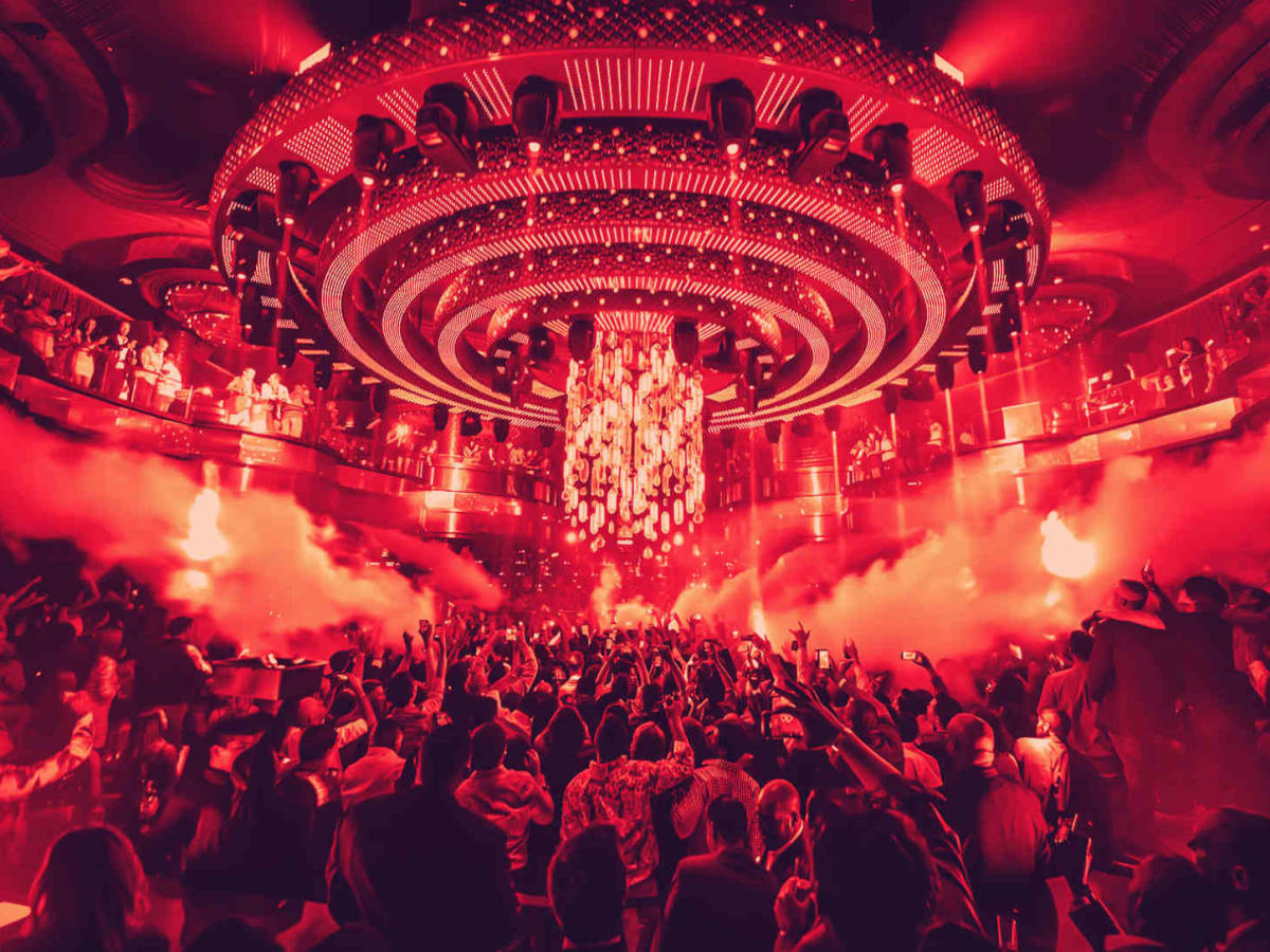 Ambiance shifts fluidly with the calendar. The main room channels a cavernous intensity, walls lined with velvet banquettes and metallic accents that reflect laser sweeps across the floor. Upstairs, the terrace introduces a casual edge—loungers arranged around a dedicated DJ booth, with misting fans combating desert heat and fire pits adding subtle warmth on cooler evenings. This duality caters to varied moods: pulse-pounding house sets downstairs contrast with open-format mixes outdoors, where conversations can actually compete with the sound. Lighting evolves from cool blues during build-ups to fiery reds at peaks, while the chandelier’s mechanical arms extend and retract, serving as a living centerpiece that captivates without overwhelming.