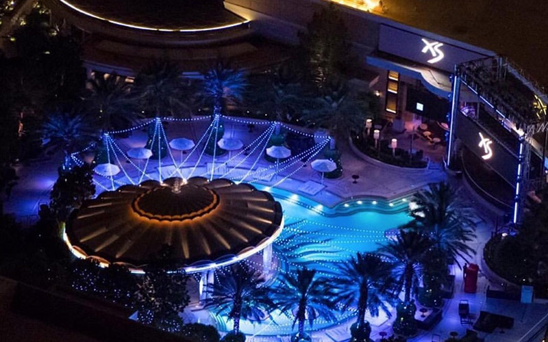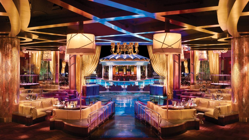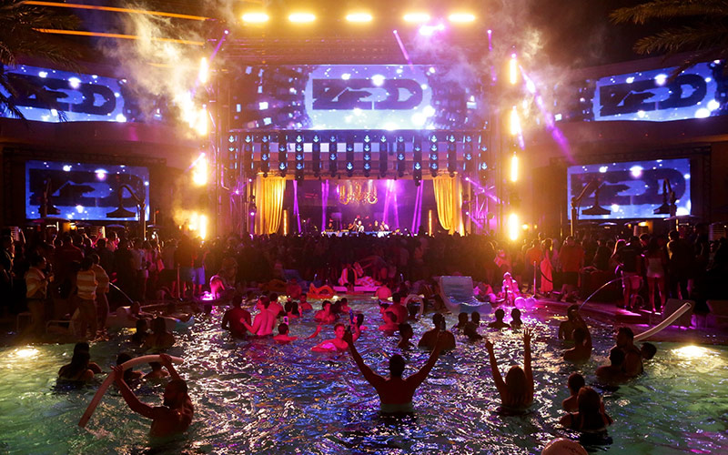 Venue flow emphasizes adaptability, with pathways linking the packed interior to the ventilated exterior, enabling shifts from dense crowds to scattered groups amid water features. Entry protocols enforce selective lists, cultivating an assembly of affluent visitors, entertainment figures, and convention attendees. Midweek previews build to peak weekends, where sound systems hit full output—visuals cascade over water jets, and fog machines layer the air during track transitions. Bachelor parties thrive here through configurable arrangements, like pool-edge pods for eight or elevated rail spots overlooking the action, promoting group cohesion and candid shots with the resort’s lit skyline as backdrop. Team members in tailored uniforms manage logistics, from ice bucket restocks to layout tweaks, maintaining an efficient backdrop that prioritizes immersion in rhythms and interactions.