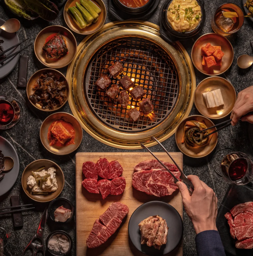 The menu emphasizes beef cuts sourced from USDA Prime, American Wagyu, and Japanese A5 varieties from regions like Kobe, Sendai, and Miyazaki. Many steaks undergo in-house dry-aging for 45, 90, or 120 days. A key offering is the Butcher’s Feast at $88.88 per person, which provides a fixed selection including starters, four cuts grilled at the table, sides such as scallion salad, steamed egg, kimchi stew, and doenjang stew, plus vanilla soft serve topped with soy sauce caramel. For a more extensive experience, the Steak Omakase runs $225, featuring a sequence of premium meats.
