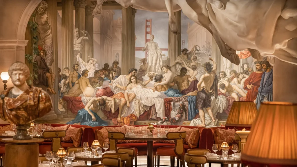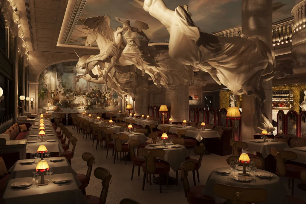 Step into Bacchanalia, and the interiors overwhelm with mythic grandeur—towering Damien Hirst sculptures, hand-painted murals of gods and muses, and 2,000-year-old Greco-Roman artifacts create a breath-taking, immersive tableau seating around 200, where toga-clad servers glide amid marble columns and flickering torchlight. The grand dining hall flows into a buzzing bar for aperitivo transitions, while the hidden Apollo’s Muse club (members like Kate Moss) pulses with exclusivity, and a petite outdoor terrace offers al fresco charm under Berkeley Square’s canopy. As dusk descends, live opera singers (Sundays until 3pm) and DJ sets ignite a rhythmic hum, drawing a glamorous throng of influencers, executives, and visitors into a haze of applause and convivial toasts. The atmosphere is hedonistic yet refined, perfect for a reflective solo feast, romantic odyssey, or group bacchanal that blurs the line between meal and midnight rapture.