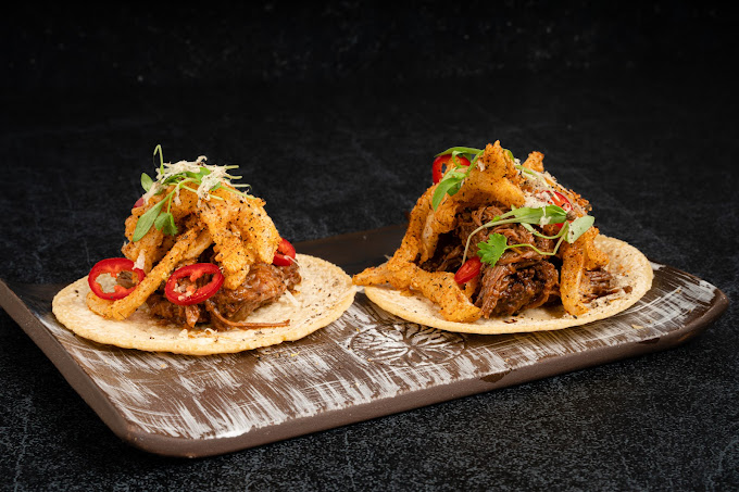 Seafood leads with the Ceviche Clásico ($20), market fish marinated in lime with sweet potato, red onion, and cancha crunch—a citrusy, oceanic ritual full of brightness. The Crispy Shrimp Taco ($18) stuffs battered prawns into soft shells with cabbage slaw, chipotle aioli, and mango salsa, offering a crunchy, spicy hand-held delight. Sushi fusion shines in the Dragon Roll ($22), tempura shrimp and eel wrapped with unagi glaze and tobiko pearls—crisp and umami-packed. Mains feature the Wagyu Short Rib ($32), slow-braised beef in ancho-chili glaze with sticky rice and scallions, tender and intensely spiced. The Grilled Octopus ($26) chars tentacles with romesco, chickpeas, and preserved lemon for smoky succulence. For a bold surf-and-turf, the Arroz Nikkei ($28) wok-tosses saffron rice with prawns, squid, and chili paste, a harmonious Iberian-Pacific medley. Vegetarians savor the Roasted Cauliflower ($16), spiced florets with tahini yogurt, pomegranate, and harissa for nutty, fiery depth.
